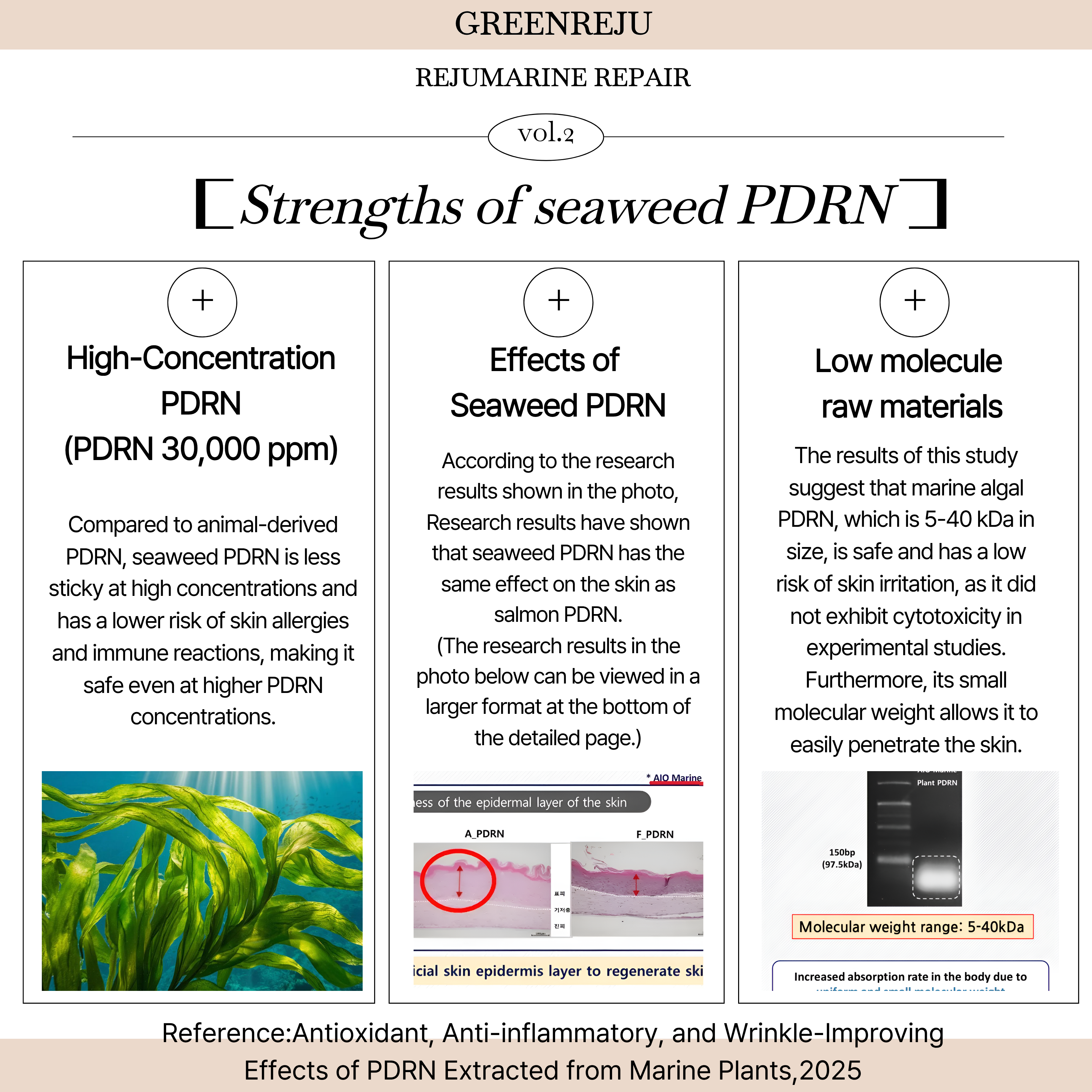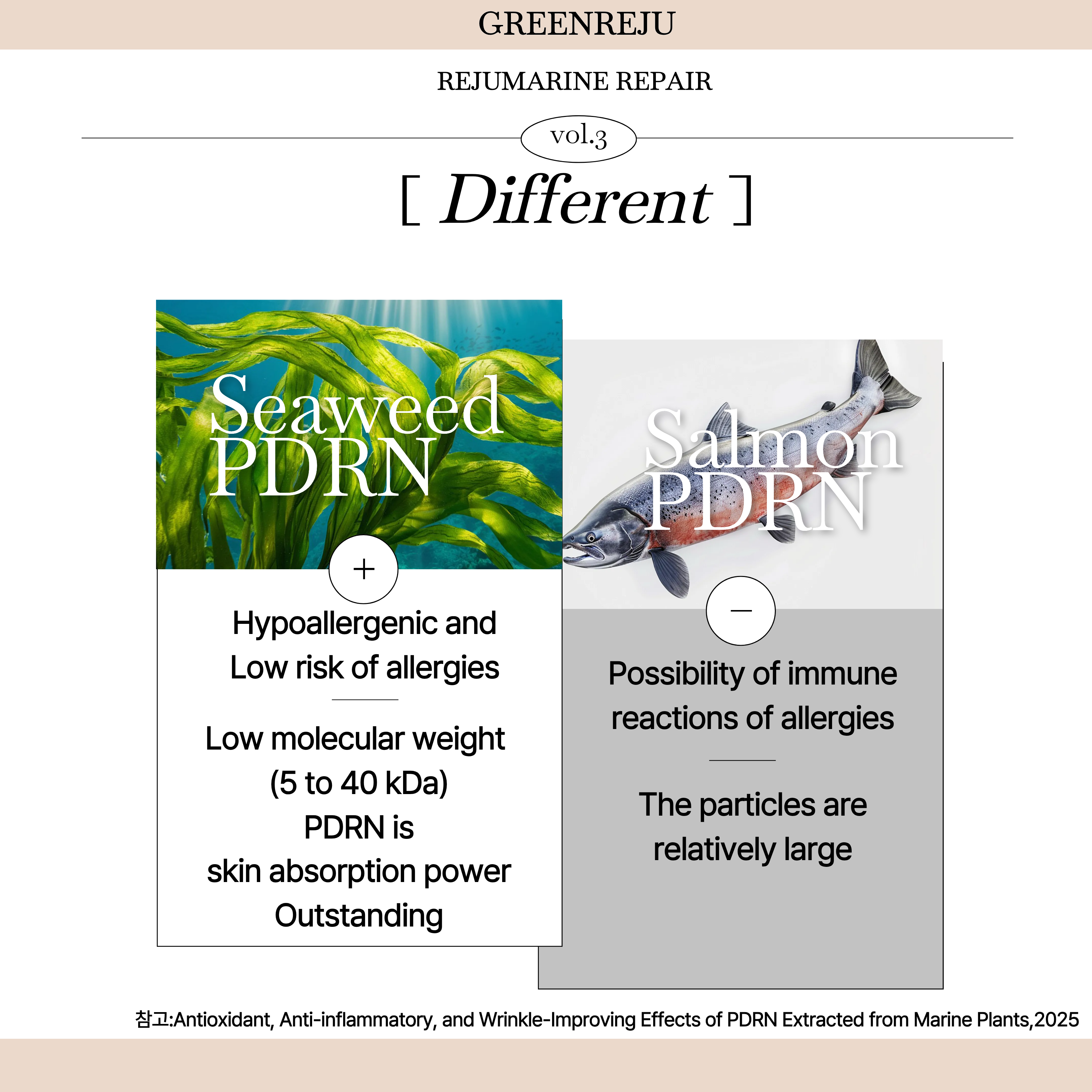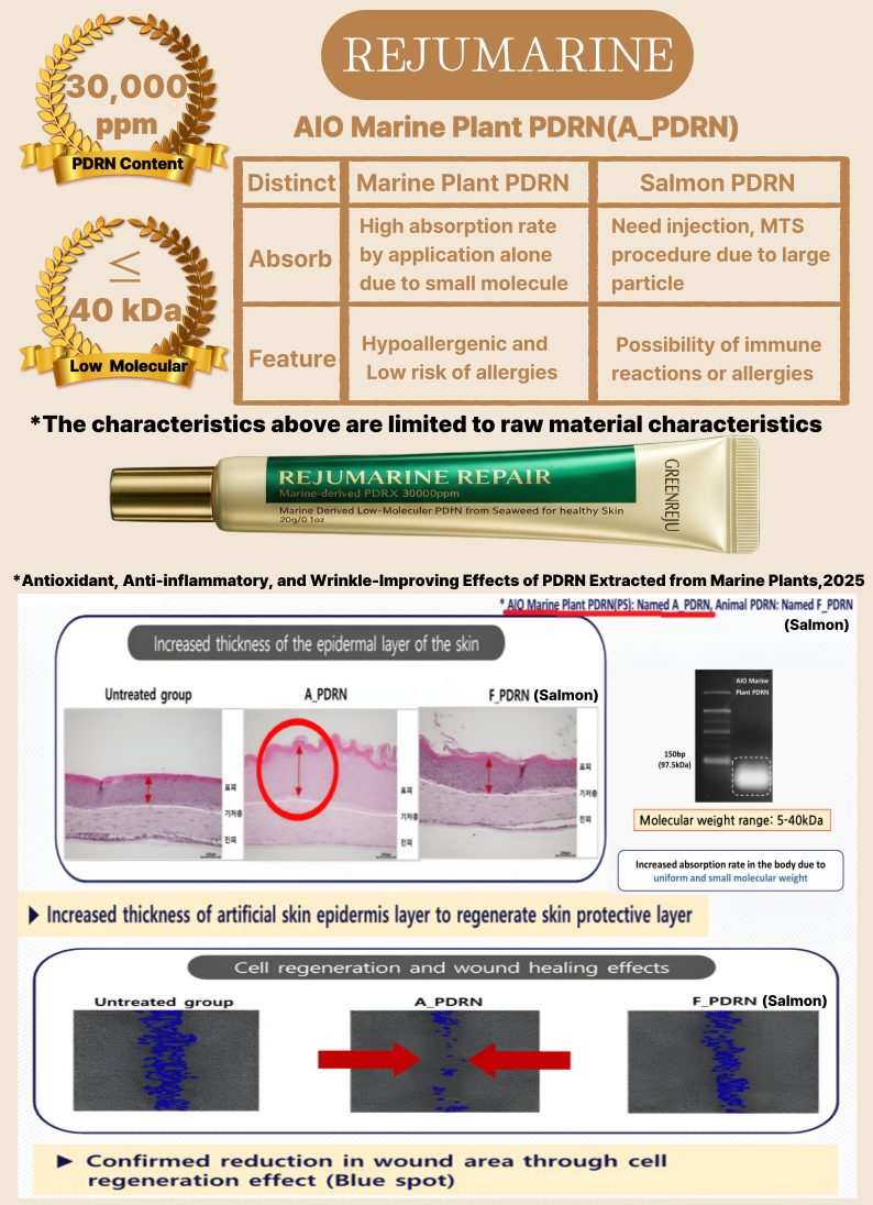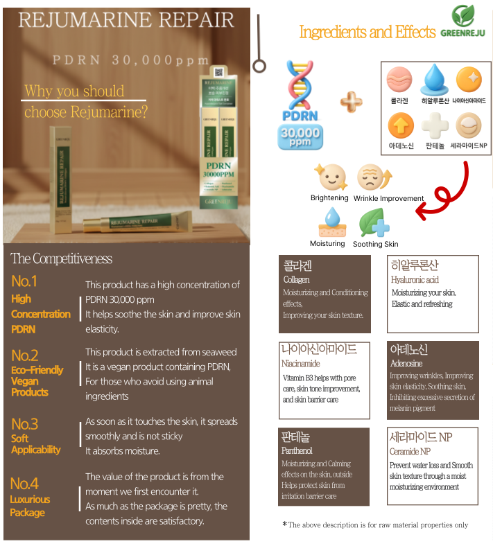 Rejumarine PDRN Repair Cream is a vegan product containing 30,000 ppm of PDRN extracted from seaweed. It carries a lower risk of allergies and immune reactions compared to animal-derived PDRN.